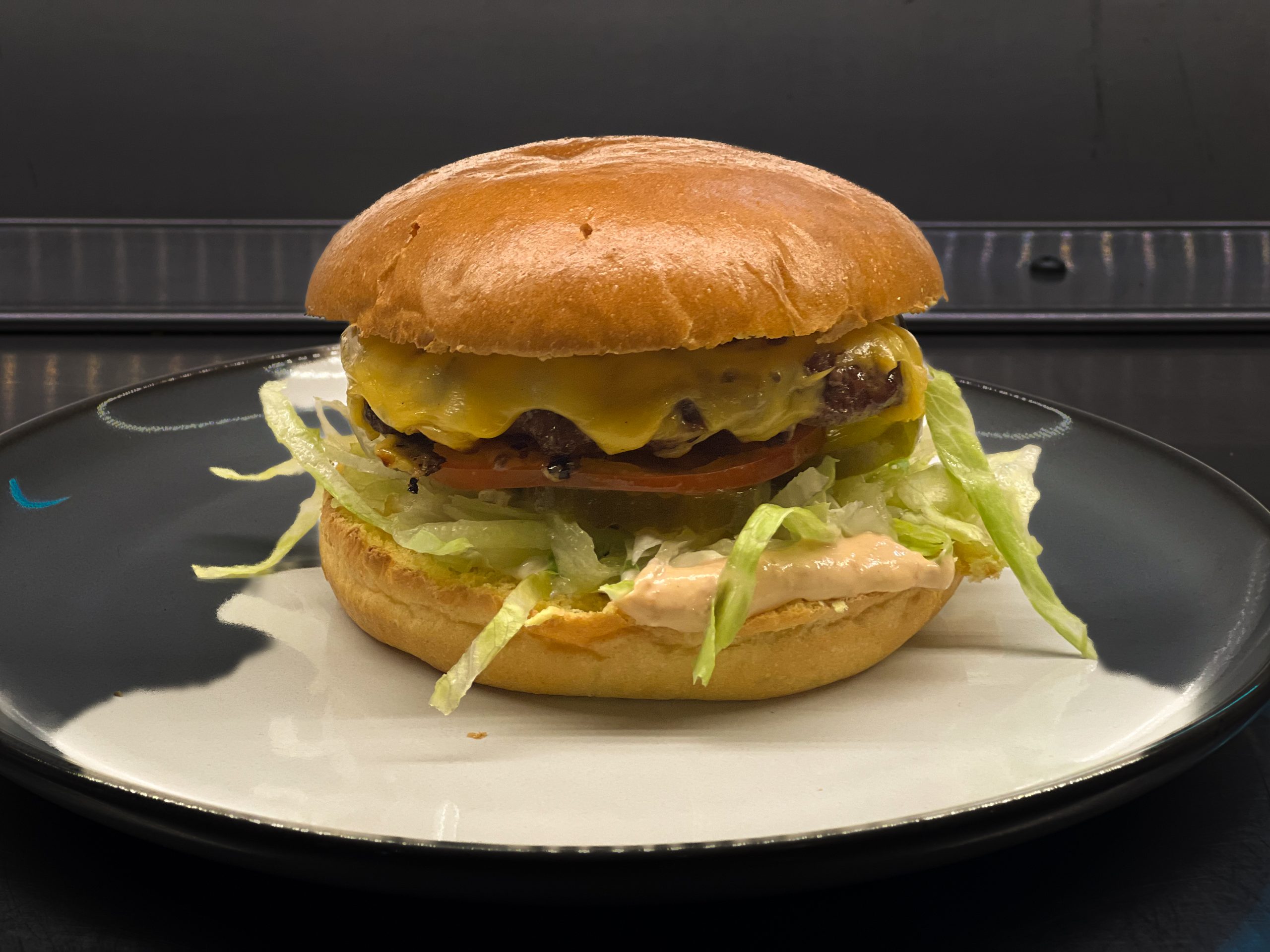 Disfruta nuestra Cheese Burger en Queens Grill: 160 gramos de carne de vacuno en pan brioche con doble queso cheddar, lechuga, tomate y pepinillos. Completa tu experiencia con nuestro Menú Completo por solo 3,90 € más: incluye bebida y patatas fritas.