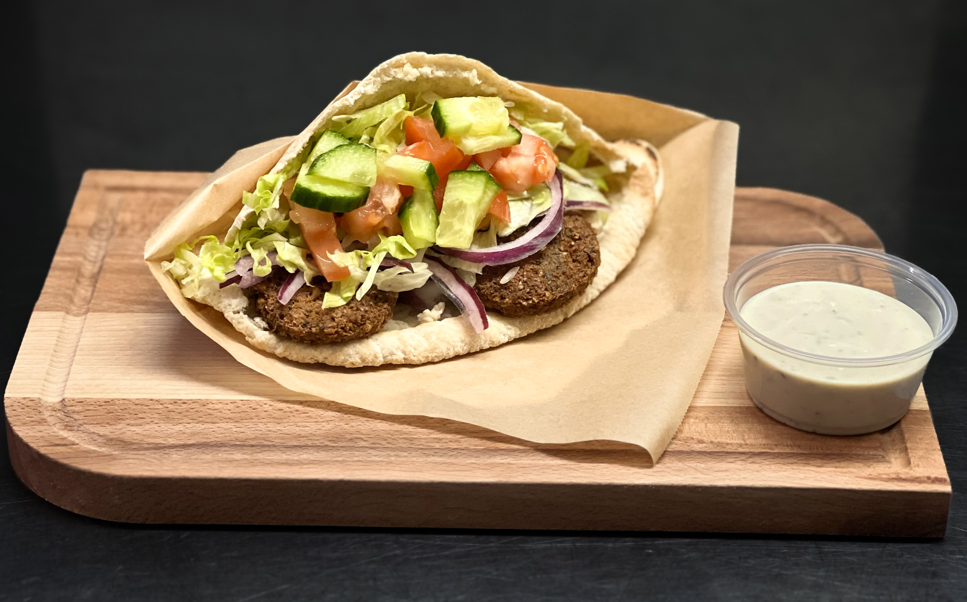Disfruta nuestro sabroso falafel en pan con 4 bolitas, lechuga, tomate, pepino, cebolla y guindilla opcional, aderezado con nuestras salsas: chili y oriental. ¡Una explosión de sabores mediterráneos!