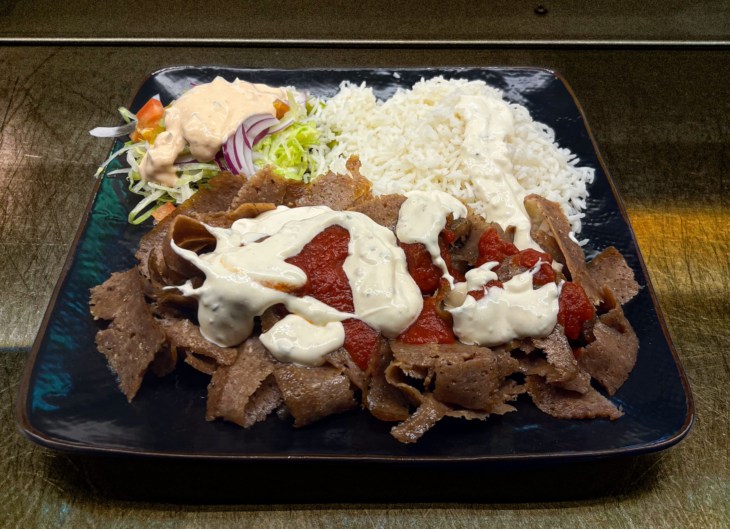 Tierna carne de kebab con lechuga, tomate, pepino, cebolla y guindilla. Acompañado de salsas chili, rosa y oriental. ¡Sabor auténtico en cada bocado!
